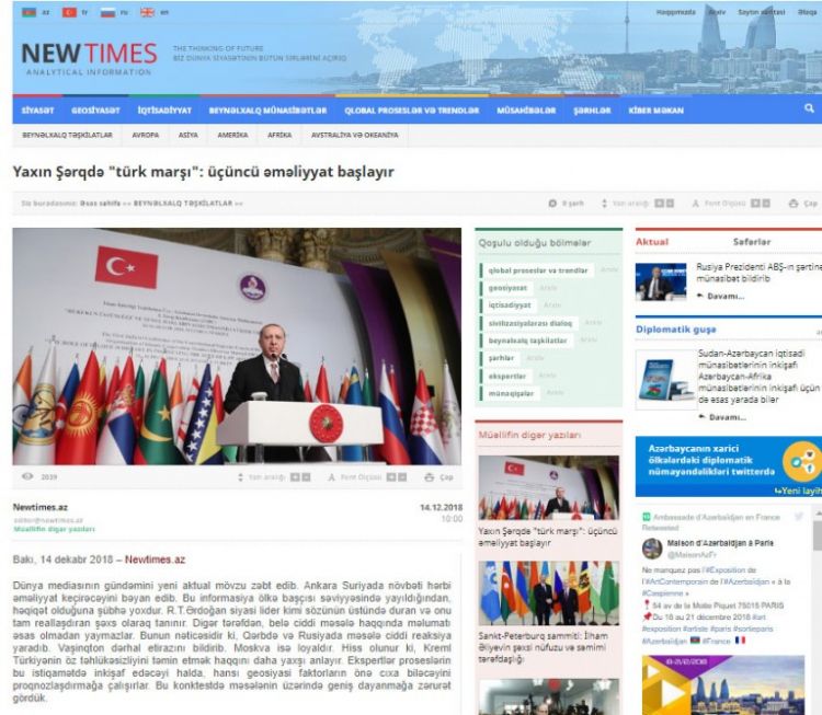 Türkiyə Prezidenti Rəcəb Tayyib Ərdoğanın dekabrın 12-də verdiyi bəyanat dünya mediası və ekspert dairələrində bomba kimi partladı. Ankara yaxın günlərdə Fərat çayının şərq sahilində genişmiqyaslı hərbi əməliyyatlara başlayacağını bəyan etdi. R.T.Ərdoğan bu əməliyyatın türk ordusunun Suriyada həyata keçirdiyi "Fərat qalxanı" (Əl-Bab) və "Zeytun budağı" (Afrin) antiterror əməliyyatlarının davamı olduğunu ifadə edib. Yəni, burada başlıca məqsəd Fəratın şərqində kök salmış terror qruplarıdır. Orada yerləşən ABŞ hərbi kontingenti ilə heç bir problem yoxdur.