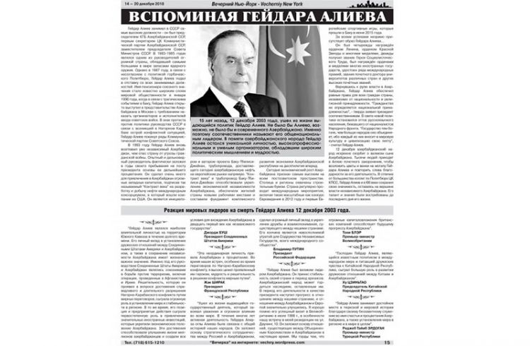 ABŞ-ın Nyu-York şəhərində rusca nəşr olunan “Veçerni Nyu-York” qəzetində Azərbaycanın ümummilli lideri Heydər Əliyev haqqında məqalə dərc olunub.