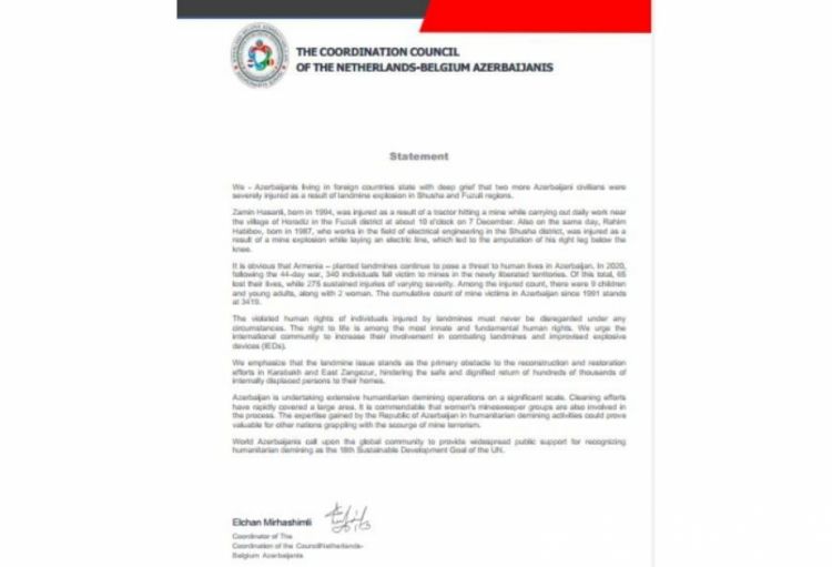 Niderland-Belçika Azərbaycanlıları Koordinasiya Şurası ölkəmizin Şuşa və Füzuli rayonlarında mina partlaması nəticəsində daha iki azərbaycanlı mülki şəxsin ağır yaralanması ilə bağlı beynəlxalq ictimaiyyətə müraciət edib.