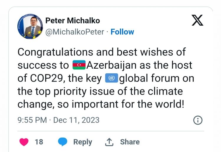 "Dünya üçün çox vacib olan iqlim dəyişikliyi ilə bağlı əsas BMT qlobal forumu - COP29-un ev sahibi kimi Azərbaycanı təbrik edirəm".