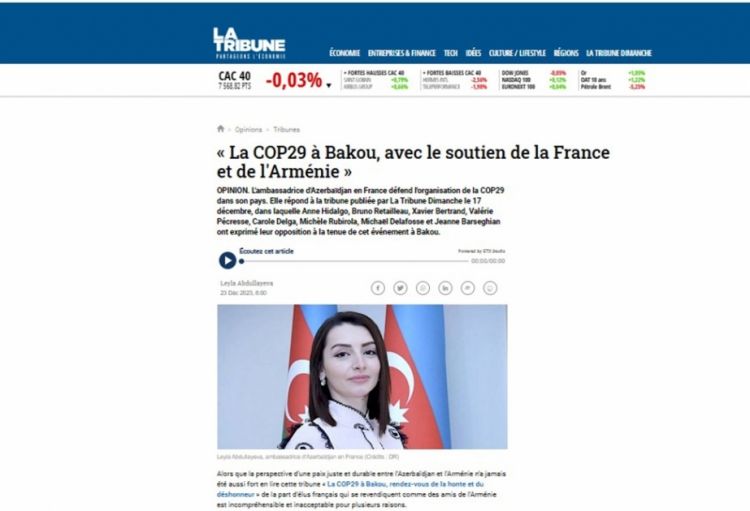 Fransanın “La Tribune” portalında Azərbaycanın bu ölkədəki səfiri Leyla Abdullayevanın bu ölkənin bir qrup seçkili orqanının nümayəndələrinin imzaladığı və bu portalda dərc edilmiş məqaləsinə cavabı işıqlandırılıb.
